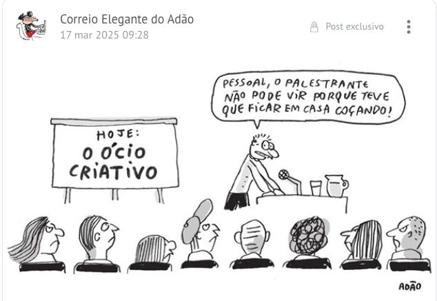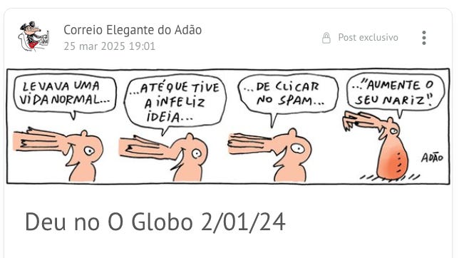 2. Todos os dias você recebe um cartum ou texto inéditos pela manhã e uma tira do jornal O Globo (com um ano de antiguidade) à tardinha. Veja abaixo dois exemplos;
