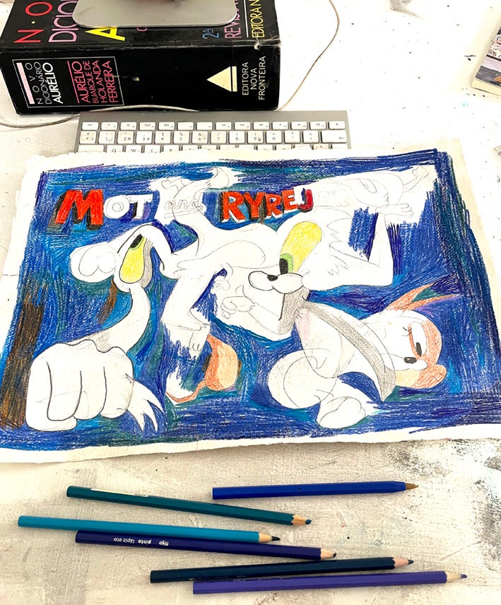 O resto do dia foi dividido entre organizar uma coletânea das minhas tiras da Folha de São Paulo e mergulhar com tudo (acrílica, lápis de cor, caneta Bic) num papel reciclado belga que já tinha uma pintura por baixo. Dizem que existem especialistas capazes de descobrir pinturas escondidas — e escondidas das escondidas — com uma luz tipo raio X. Pois bem, aí está o desenho — e só posto porque me agrada.