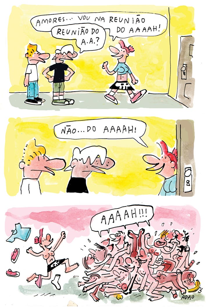 Adão — Tá bom. Vou te contar a verdade. Criei você em 1995, numa manhã de ressaca. Na noite anterior, eu tinha saído com o Angeli. Fomos ao bar The Jungle, em Pinheiros. Fazia um tempão que eu queria criar uma tira para a Folha de S.Paulo, mas nada me agradava. Na hora de ir embora, Angeli disse: “Adão, por que você não cria um projeto de tira para a Folha?” Depois que nos despedimos, fui caminhando pra casa e aquela pergunta ficou reverberando na minha cabeça.
