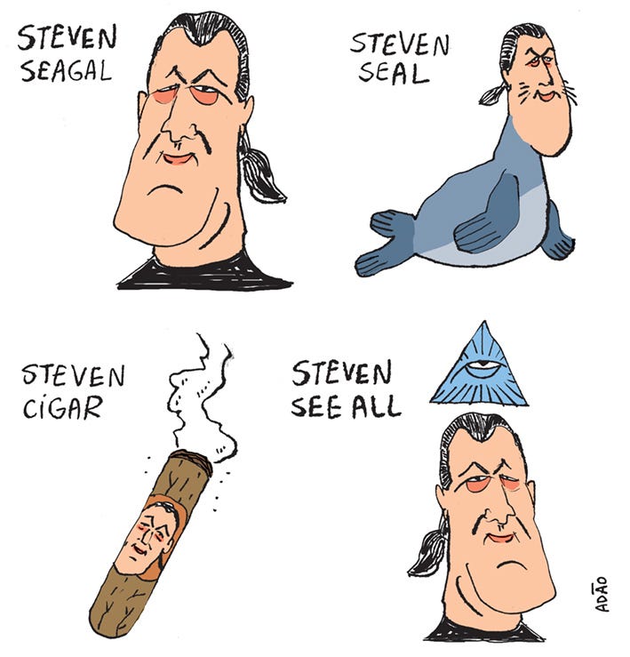 Hoje o ator e artista marcial Steven Seagal completa 74 primaveras. Não sou fã dele — só incluí a estrela na série de trocadilhos infames porque foi o que o “aniversariantes do dia” me ofereceu na tela.